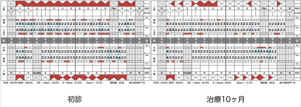 歯周外科(歯ぐきを切って外科的に歯石を取ったりすること)を行わず、患者様と2人3脚で改善している様は